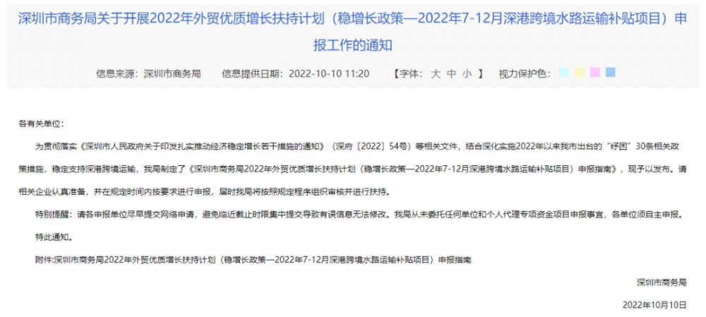 10月10日,深圳市商务局制定发布《深圳市商务局2022年外贸优质增长扶持计划(稳增长政策—2022年7-12月深港跨境水路运输补贴项目)申报指南》,对2022年7-12月企业深港陆路运输转海上快线运输的进出口吞吐量增量的新增运费成本进行逐月补贴。