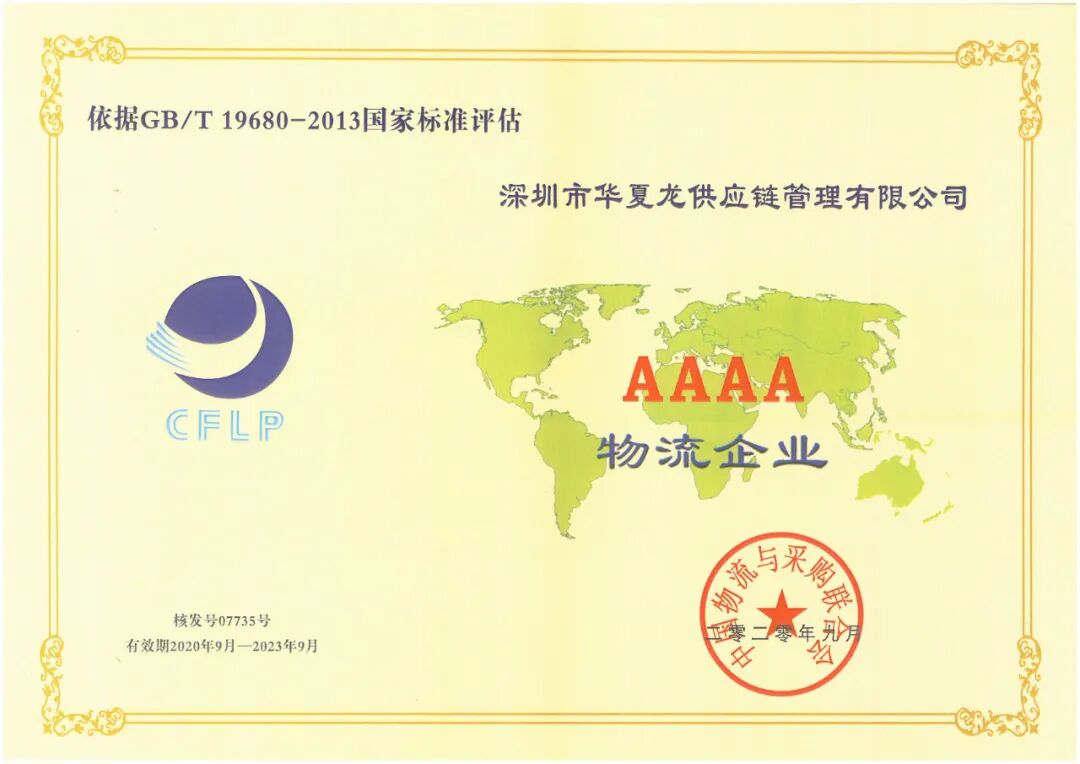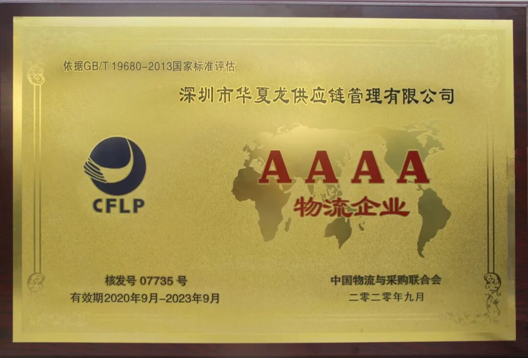 深圳市华夏龙供应链管理有限公司正式被授予4A级物流企业。