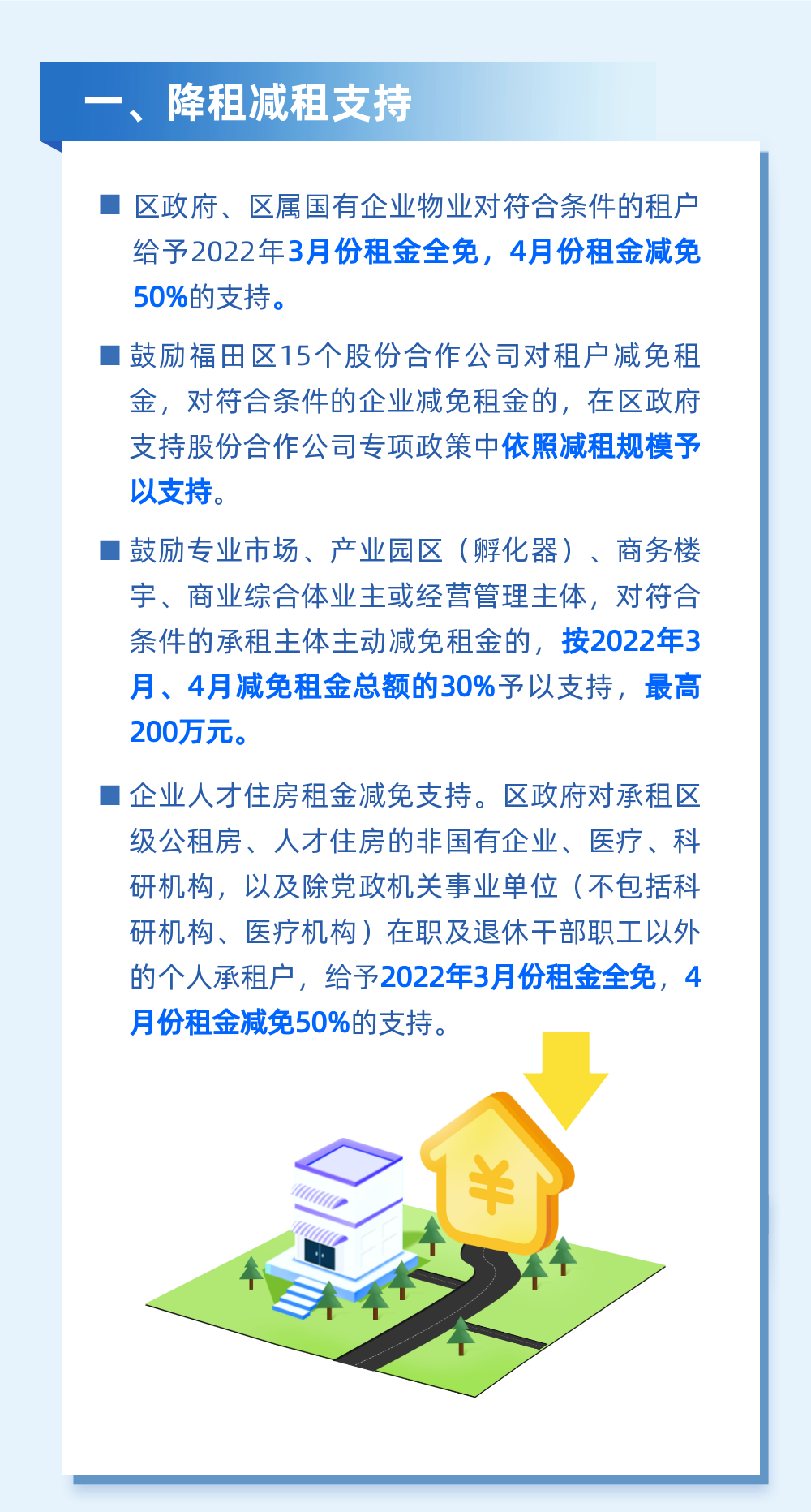鼓励倡导其他市场主体参照减免物业租金。对2022年3月1日至5月31日期间实际减免租金60万元以上的社区股份合作公司(按归属社区股份合作公司的租金计算),及经营管理工业园区、写字楼、商场等物业的企业,按其减免实际租户租金的20%予以支持,单家企业最高200万元。(牵头单位:区投资推广和企业服务中心)